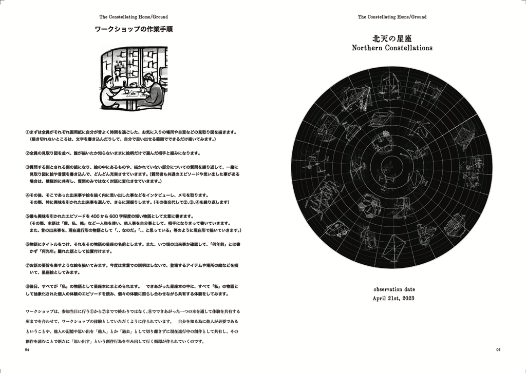 東京大学の教育学部で企業向けにアーティストが考案したワークショップを体験してもらうTACワークショップの講師を務めました。 今回は小さい頃によく時間を過ごした場所や部屋の絵をかいてから、二人組になって話し合いその絵のディティールを充実させるところから始まる。一人で考えても思い出せなかった昔の自分の「普段」を思い出す試み。 会話の中ででてきたエピソードをその人になりかわって自分のお話しとして「物語化」するという長丁場のワークショップ。 参加者の皆様には、お忙しい中熱心に取り組んでいただいて、とても良いワークショップになりました。ここでできあがった物語をあつめた本を編しました。すべて一人称の「私」の物語として抽出された個々のお話で「星座本」を作り、それを読んで記憶を物語として共有するところまでが体験となっています。(2023年.4月)
