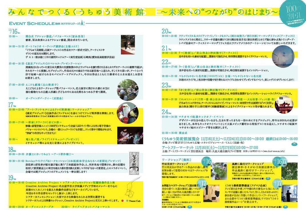 名古屋テレビ塔を使って行われる企画展「くうちゅう美術館」に参加しました! 今回は日本紙媒体学会&なるへそ新聞社の企画者としてプロジェクトの紹介展示でした。 期間中ライブとトークイベントも開催!たくさんの方々においでいただきました、ありがとうございます。いろいろ新しい出会いもあって実りある「芸祭」みたいで楽しかったです。