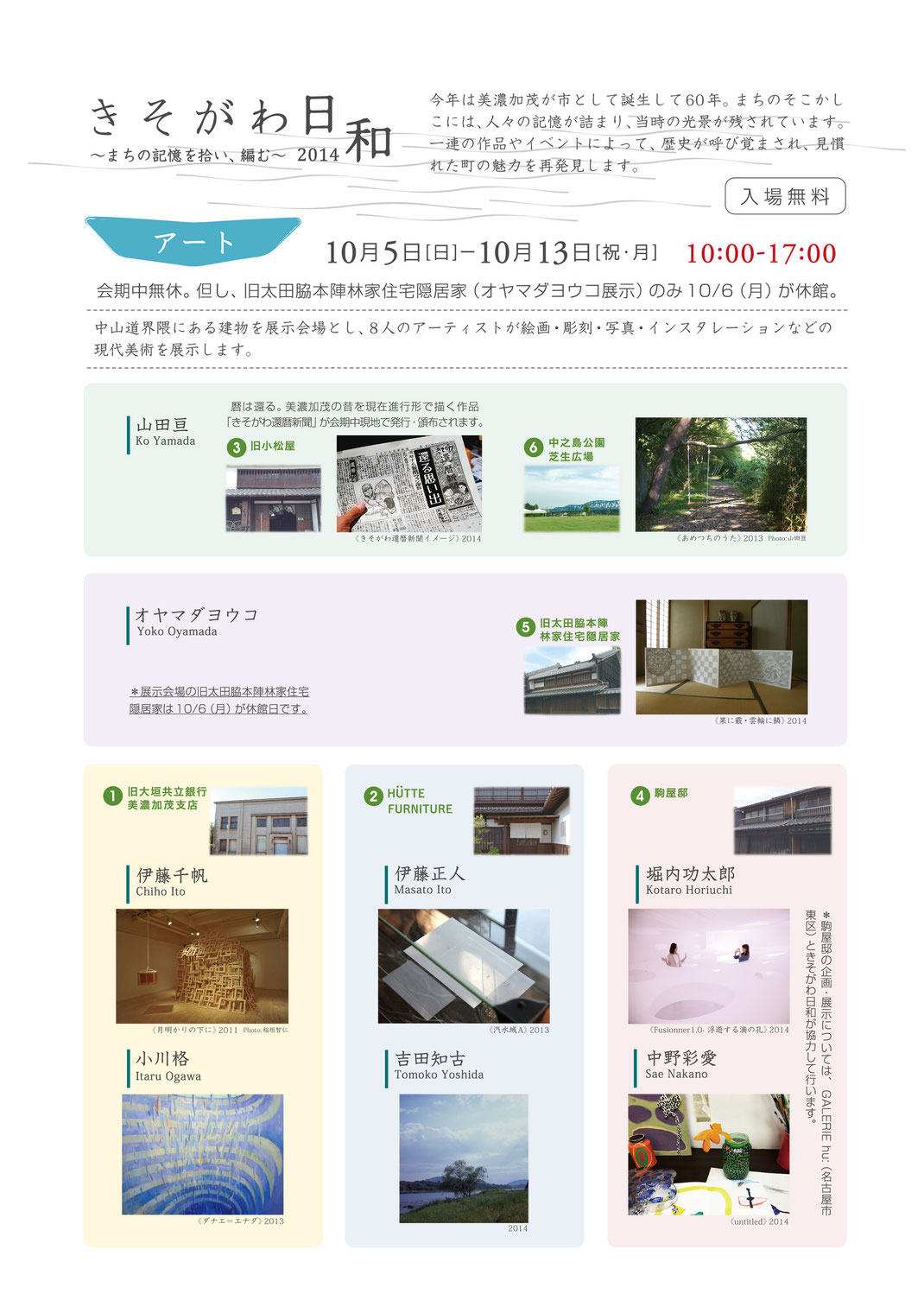 2014年10月5日〜15日、岐阜県美濃加茂市で毎年行われるアートイベント「きそがわ日和」に作家として参加します。今回は美濃加茂市60周年にちなんだ、暦を還す新聞「きそがわ還暦新聞」を発行するプロジェクトと、そこから掘り起こされた現在進行形の思い出を声のインスタレーションの作品です。