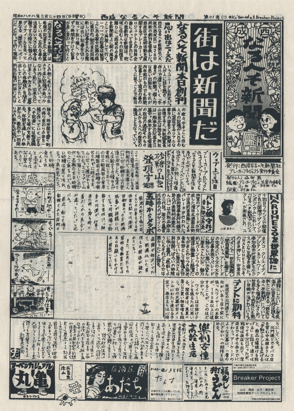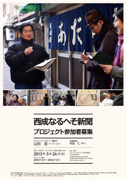 2013年度一年間に渡り大阪・西成のBreaker Projectとともに「なるへそ新聞プロジェクト」を現地で展開しました。短期集中型だったワークショップを年間を通して継続する試み。現地の心強い記者の方々とともにプロジェクトは着々と進行し、2014年2月には全体の報告展示を大阪enocoで開催しました!